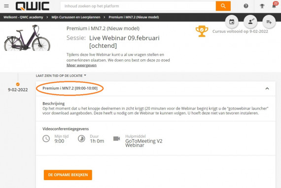 Klik op de titel en tijd van de sessie en vervolgens verschijnt de oranje knop ‘De opname bekijken’